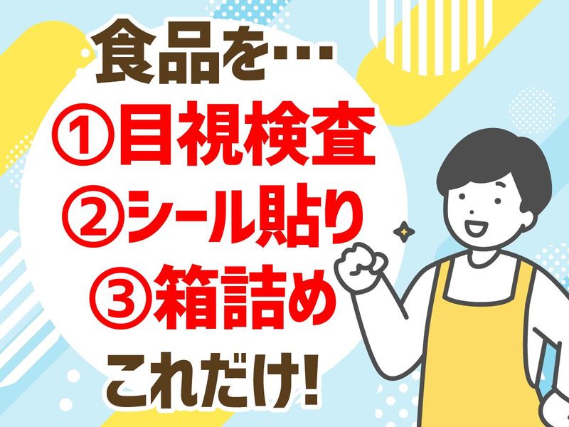 職種/仕事内容 | 仕事内容 ■■簡単な作業で初心者でも安心!■■ →1.不純物等が混入していないかの目視検品! →2.品質表示シール貼付け! →3.箱詰めをする! ▲この3つだけ!2~3日で慣れますよ♪ ★最初は先輩スタッフがサポートします! 未経験の方もお気軽にご応募ください☆ |