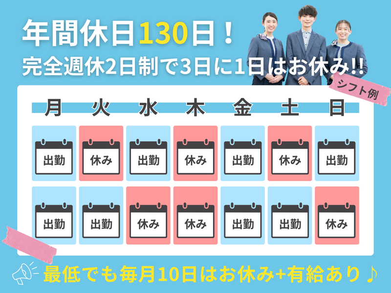 休日休暇 | 休日休暇 完全週休二日制(シフト制/月9~11日) →最低でも毎月10日はお休み(2月のみ9日)で、3日に1日はお休みの環境です! ≪出勤イメージ≫ □:出勤日 ●:お休み ★:有給 月 火 水 木 金 土 日 □ □ ● ● □ □ □ ● □ □ □ ★ □ □ □ ● □ ● □ ● □ □ □ ● ● □ □ ● ● □ □ <勤務時間の特徴> ●「時短勤務」制度あり 【入社1年目から年間休日130日!(公休120日+有給休暇10日(100%消化必須)】 →例えば入社4年目の方は年間休日136日! ・有給休暇(入社4ヶ月目から10日付与) ・5連休以上の長期休暇ももちろんok! ・慶弔休暇、産前産後休暇なども完備! ・女性スタッフの育休取得率100% ・男性スタッフの育休取得率56.5%→更に取得が進むよう社内で奨励中! |