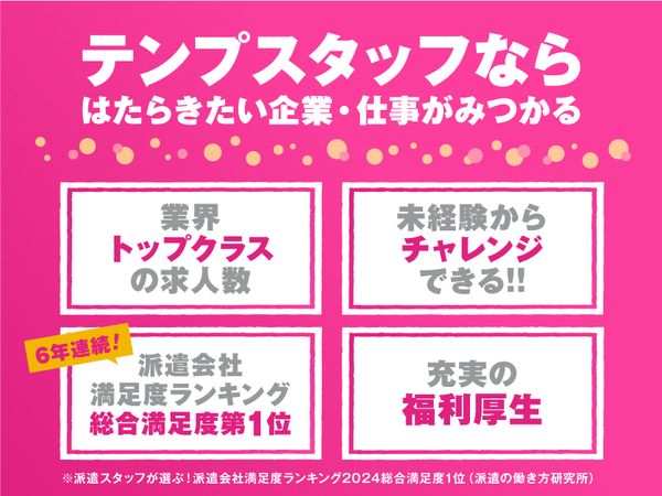 その他 | キャッチコピー 【岩波駅徒歩8分】 \通訳・翻訳/ 在宅勤務の利用であなたの英語スキルが輝く! アピールポイント \* 業界最大手*安心のサポートあり */ 〇交通費別途支給・産休育休など福利厚生充実〇 ○eラーニング・Excelスキルアップ研修も無料○ 雇用形態 派遣社員 掲載企業名 パーソルテンプスタッフ(株) /TS25-0815431 応募受付先電話番号 0120-537-102 その他 \テンプで理想のお仕事探しをしよう!/ パーソルテンプスタッフでは人気の一般事務やデータ入力・学校事務のお仕事から、コールセンターや経理、通訳・翻訳などの専門職まで、オフィスワークを中心に幅広い案件をご紹介しています。 また、『テンプ=オフィスワーク』のイメージが強くありますが、実は軽作業や販売、飲食やIT業界にまで幅広い案件をご用意〇 更に、希望月収(月20万円以上や扶養内)、希望勤務期間(紹介予定派遣や短期・土日休み)、在宅勤務有(リモートワーク・テレワーク)の働き方もあります。 「すぐの転職は考えていないけど…」の”とりあえず登録”もOK! お気軽にご相談くださいね! \テンプで仕事を見つけたスタッフさんの声は…?/ 30代女性: 「長らく主婦として過ごしてきたけど、久しぶりに働きたい!と思ってテンプで受付事務のお仕事を始めました。 働き始めてから、5歳の娘に『働いているママもかっこいいね!』と言われたのが嬉しかったです。」 20代女性: 「アパレル販売の経験はありましたが、シフト制でなく固定時間に働く仕事がしたいと思って銀行での金融事務を選びました。 データ入力がメインですが、接客業務も適度にあり前職のスキルが活かせています!」 30代女性: 「病院での医療事務、官公庁での短期案件など、テンプの派遣は種類が豊富! 『月収●万円以上』『駅チカ・駅直結がいい』『服装自由・ネイルOKが良い』など希望を伝えると、条件にピッタリのお仕事を紹介してくれました!」 企業情報(備考) 企業名:パーソルテンプスタッフ株式会社 中部キャリア推進室 事業内容:■労働者派遣事業 / 派13-010026 ■有料職業紹介事業 / 13-ユ-010486 URL:https://www.tempstaff.co.jp/ 【担当オフィス】 パーソルテンプスタッフ株式会社 静岡コーディネートセンター(沼津) 〒410-0801 静岡県沼津市大手町2-10-14 大樹生命沼津大手町第二ビル2F *問い合わせ先:0120-537-102(採用担当まで) <テンプの福利厚生> 社会保険完備、年次有給休暇制度、定期健康診断、労働災害保険、産前産後、育児休業制度 <リフレッシュ&エンジョイ> ・ホテルの優待利用 ・カーシェアリングサービス優待利用 ・ベビーシッターサービス(1時間1,000円~) ・家事代行サービス(10%割引) ・クッキング教室の割引 ❖ご希望のお仕事、働き方を全力でサポートできる実績が多数あります❖ 「家から近くて残業なし」「資格をとって独立し収入が安定がするまで週3日」 「子供が小さい間だけ16時まで」「家庭と両立して扶養内勤務したい」 「週末はプライベートを充実させたいから土日祝休み」 もちろん派遣のまま「週3→週4→週5フルタイム」と変化させていくことも。 日数・時間・期間、キャリアやスキルにあわせた仕事のご紹介が可能です。業種・職種もさまざまで未経験からチャレンジできる仕事もございます。 常時30,000件以上の求人の中から希望に合った仕事がきっと見つかります。 ❖福利厚生やスキルアップのサポートが充実❖ 各種社会保険、健康診断や有給休暇制度もあります。ベビーシッターや家事代行などの割引サービスも充実。社会保険、健康診断、有給休暇制度、産休・育休制度もあるので安心です。 またスキルアップ支援としてOA・語学や資格取得のための講座をご用意しています。 隙間時間に学習できる無料e-ラーニングの他、OA講座、ビジネス講座や簿記等の資格取得をサポートする講座も随時開催。 【お仕事№】TS25-0815431 |